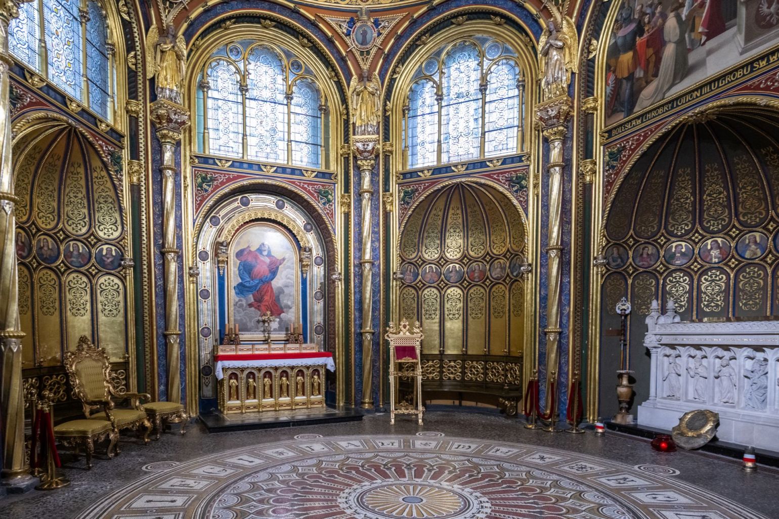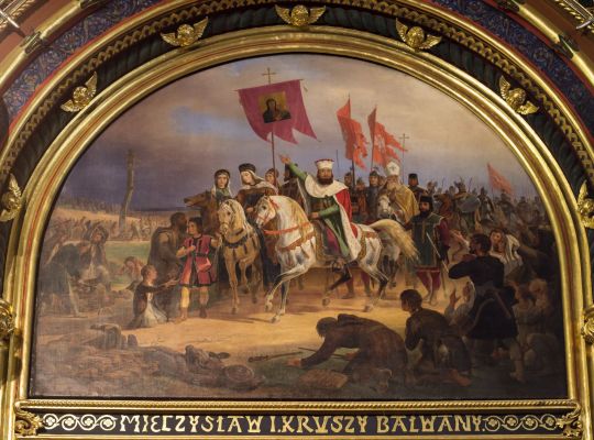 Szczególnie bogata jest dekoracja artystyczna kaplicy. Obrazy przedstawiają Mieszka i niszczącego przedchrześicjańskie wizerunki religijne (Mieczysław i kruszy bałwany) oraz Bolesława Chrobrego z cesarzem Ottonem III u grobu pierwszego męczennika ziem polskich – św. Wojciecha. Obraz wniebowzięcia Najświętszej Marii Panny Ufundowany przez Konstancję Raczyńską) oraz posadzka z łacińskim napisem Miecislaus Dux Boleslaus Rex (Mieczysław książę Bolesław król) złożone są z tysięcy drobnych kamieni tworzących mozaikę. Na sklepieniu przedstawiono dwudziestu polskich błogosławionych i świętych z centralną postacią Boga Ojca. Cztery świątobliwe księżne z XIII wieku (św. Jadwiga Śląska, bł. Jolanta Helena, bł. Salomea, bł. Kunegunda) związane były z dynastią Piastów, także wielkopolskich