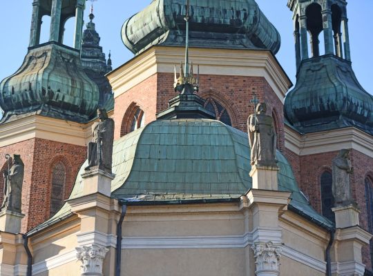 Z zewnątrz kaplica wyróżnia się kopułowym dachem ze złotą koroną i krzyżem oraz ustawionymi w drugiej połowie XX wieku kamiennymi posągami Dobrawy, Mieszka I, Bolesława Chrobrego i biskupa Jordana.