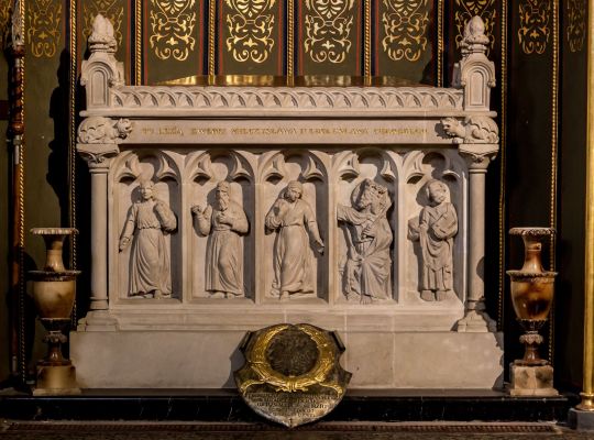 Zaprojektowany przez Franciszka Lanciego i Gustava Hessego sarkofag pierwszych Piastów nawiązuje formą do postawionego przez Kazimierza Wielkiego grobowca Bolesława Chrobrego. Mieści on trumienkę z przemieszanymi, według tradycji, prochami ojca i syna. W neogotycką strukturę wmurowano płaskorzeźby Chrystusa i św. Piotra, pochodzące ze średniowiecznej tumby Chrobrego.