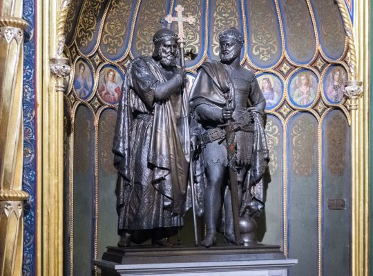 Idee przyświecające budowie Złotej Kaplicy w pełni ukazuje pomnik władców piastowskich wykonany z brązu. Przedstawia on księcia Mieszka i z krzyżem, znakiem zbawienia, a zarazem symbolem chrztu, oraz króla Bolesława Chrobrego z mieczem, atrybutem władcy-rycerza. Ojciec reprezentuje kontemplację, zaś syn działanie. Autor dzieła – berliński rzeźbiarz Christian Rauch otrzymał od Edwarda Raczyńskiego szczegółowe wskazówki co do wyglądu twarzy, uzbrojenia oraz stroju władców. Jedna z nich dotyczyła nadania Bolesławowi Chrobremu rysów bohatera wojen napoleońskich, księcia Józefa Poniatowskiego.