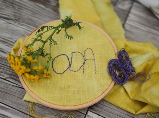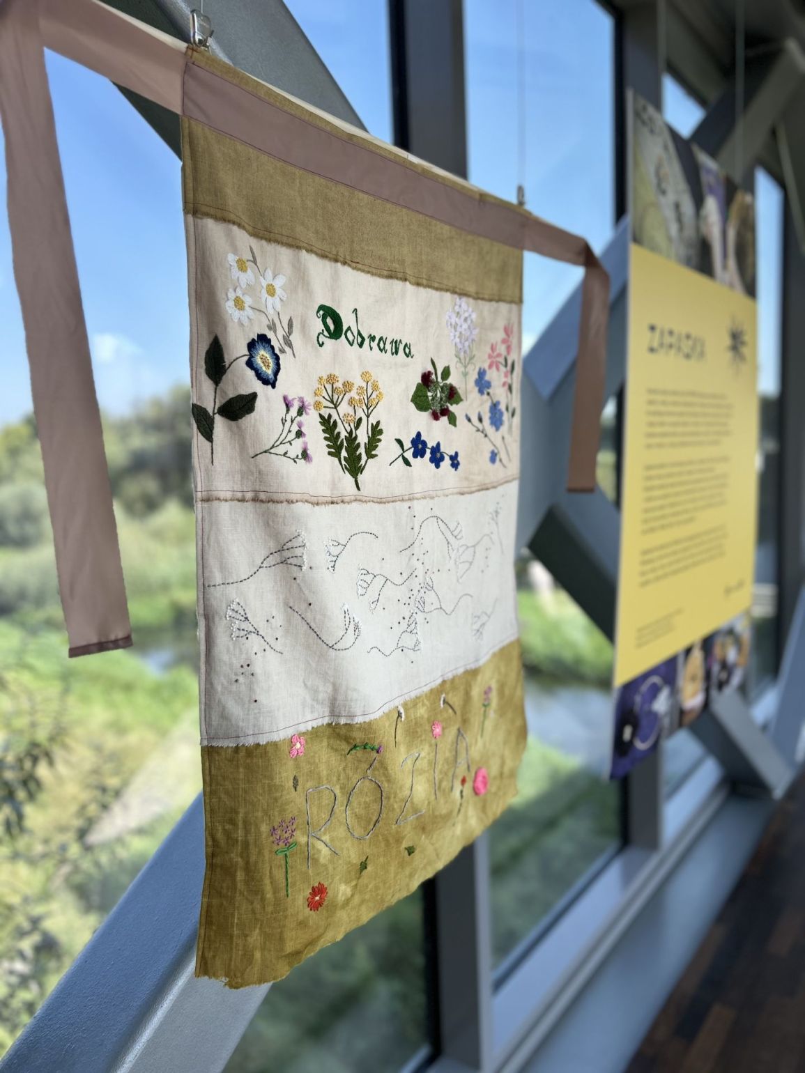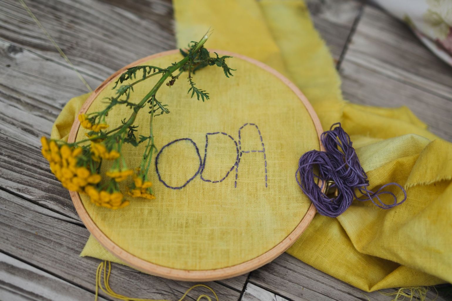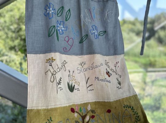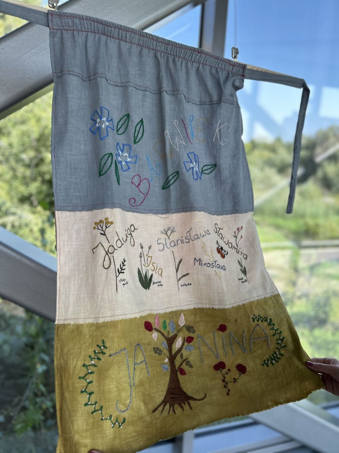 W ramach spotkań stworzyliśmy zapaskę z naturalnych materiałów w różnych technikach związanych z rzemiosłem artystycznym barwierstwem, haftem, szyciem ręcznym.