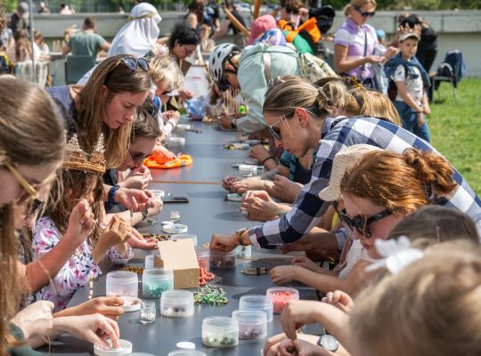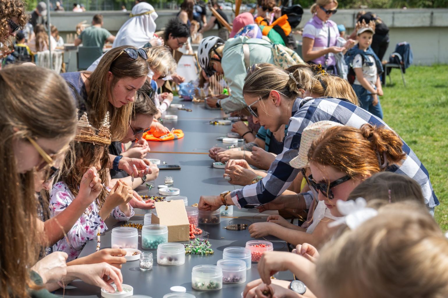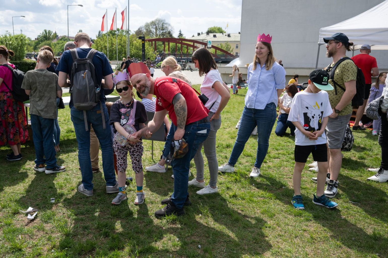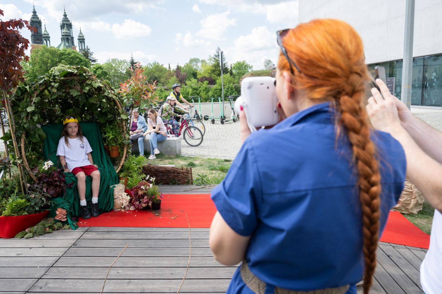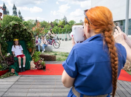 Podczas Królewskiej Majówki nie mogło zabraknąć ekologicznego tronu, który symbolicznie stanął w naszym ogrodzie na tle Ostrowa Tumskiego, przyciągając rodziny z dziećmi. Podczas warsztatów każdy mógł poznać technikę sitodruku, ozdabiając przyniesione przez siebie koszulki czy torby motywem królewskiej wyspy.
