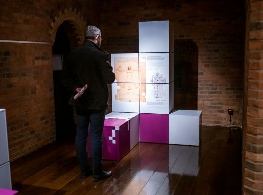 The key element of the exhibition’s arrangement is a cube. Cubic elements, which are either part of some bigger forms or broken down into smaller parts, symbolise the unanswered questions in Jan Lubrański’s biography. The sources on his life are incomplete due to the time that has passed since his death (500 years!) and many facts will never be discovered.